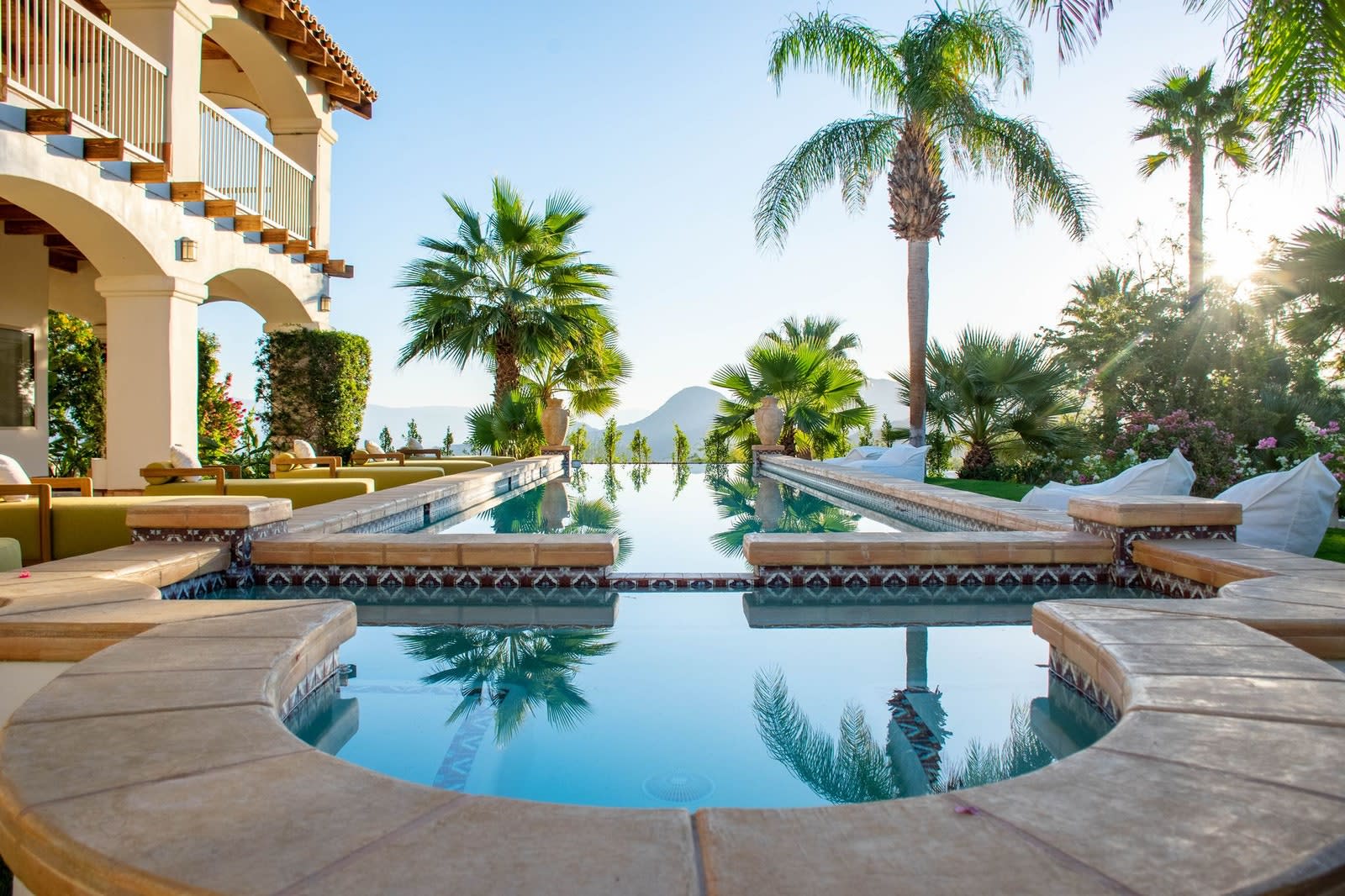 This Palm Desert estate is like a Rosewood resort in miniature, complete with a helipad and a little pond with its own sandy beach. The staffed five-acre oasis that sleeps 18 is embraced by a 360-degree patchwork of mountains and valleys, plus Edenic gardens bursting with butterflies. Equally awe-inspiring are the glam, cathedral-like living room and almost endless saltwater pool, the property’s heart. Modern meets Spanish hacienda architecture—there’s a working mission bell—for relaxed refinement: See covetable wallpapers including a life-sized tropical leaf motif inspired by Pierre-Joseph Redouté, and custom furniture intermingling with vintage. From $3,800/night.