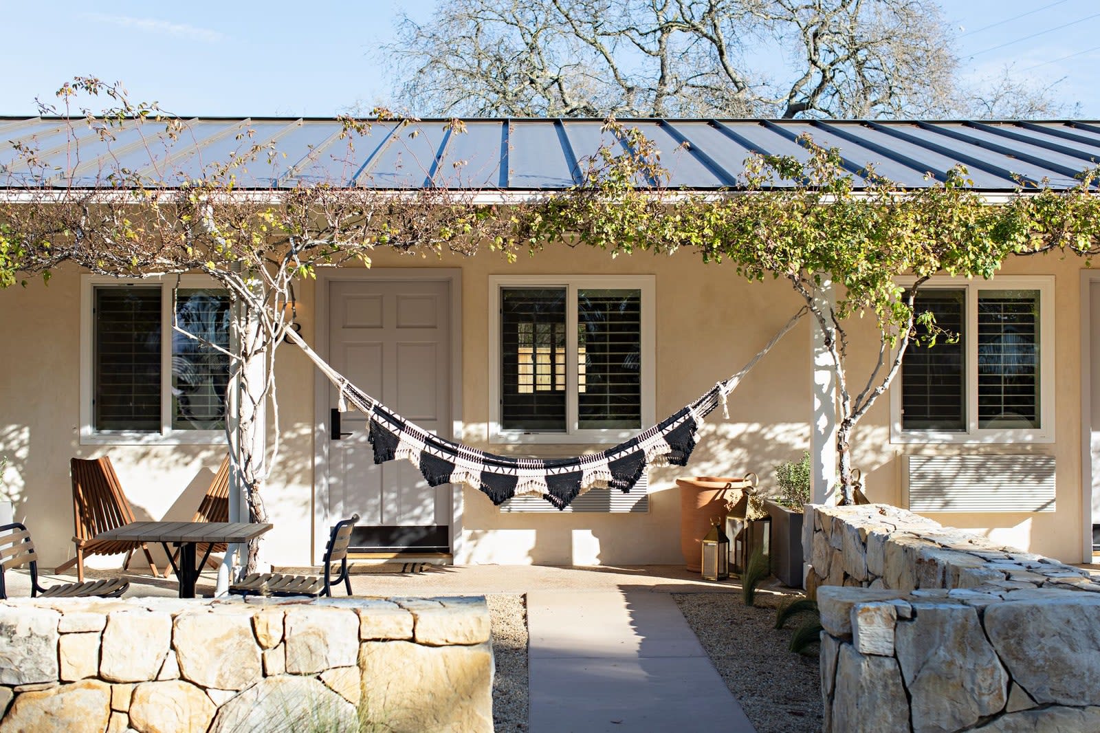 Another wine-producing region, Santa Ynez, is now home to the second charming transformation by Nomada Hotel Group (Skyview Los Alamos). The team performed a full makeover of the former Meadowlark Inn and its two acres, bringing a casually cool look to 22 roomy accommodations, now studded with local art and vintage vanities. There are tiled fireplaces, rattan headboards, Adirondack chairs, Moroccan rugs, and woven L’aviva hammocks hand-crocheted by women in a Bolivian Amazon village. In lieu of a standard restaurant, guests can purchase BBQ kits to cook on a retro Weber grill. From $179/night.