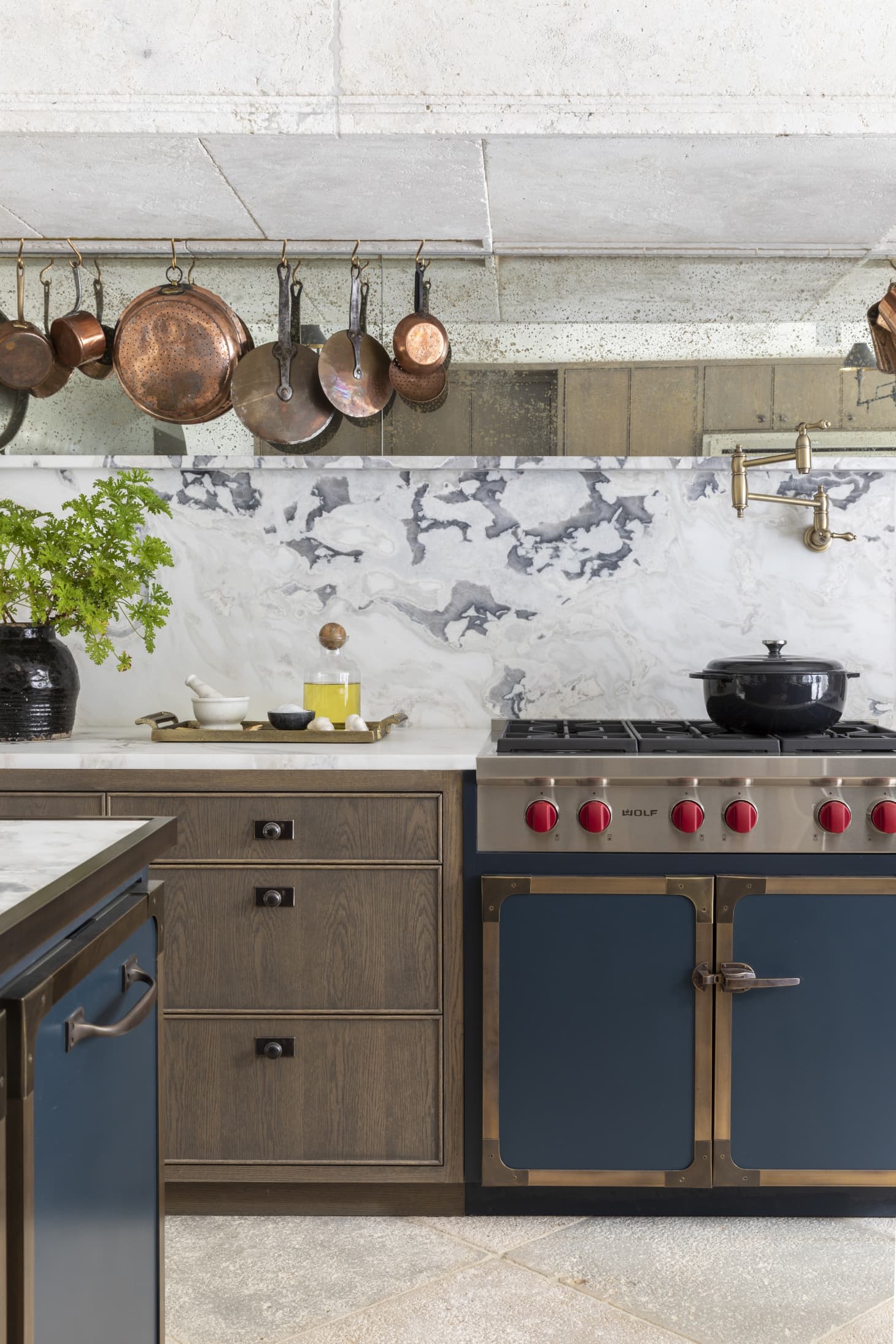 To create an eclectic, layered kitchen without having to hire a contractor, look for sleek, space-savvy ways to show off your mixed metal kitchenwares in plain sight, such as hanging your pots from overhead hooks or installing a brass-plated wall sconce above your stove.