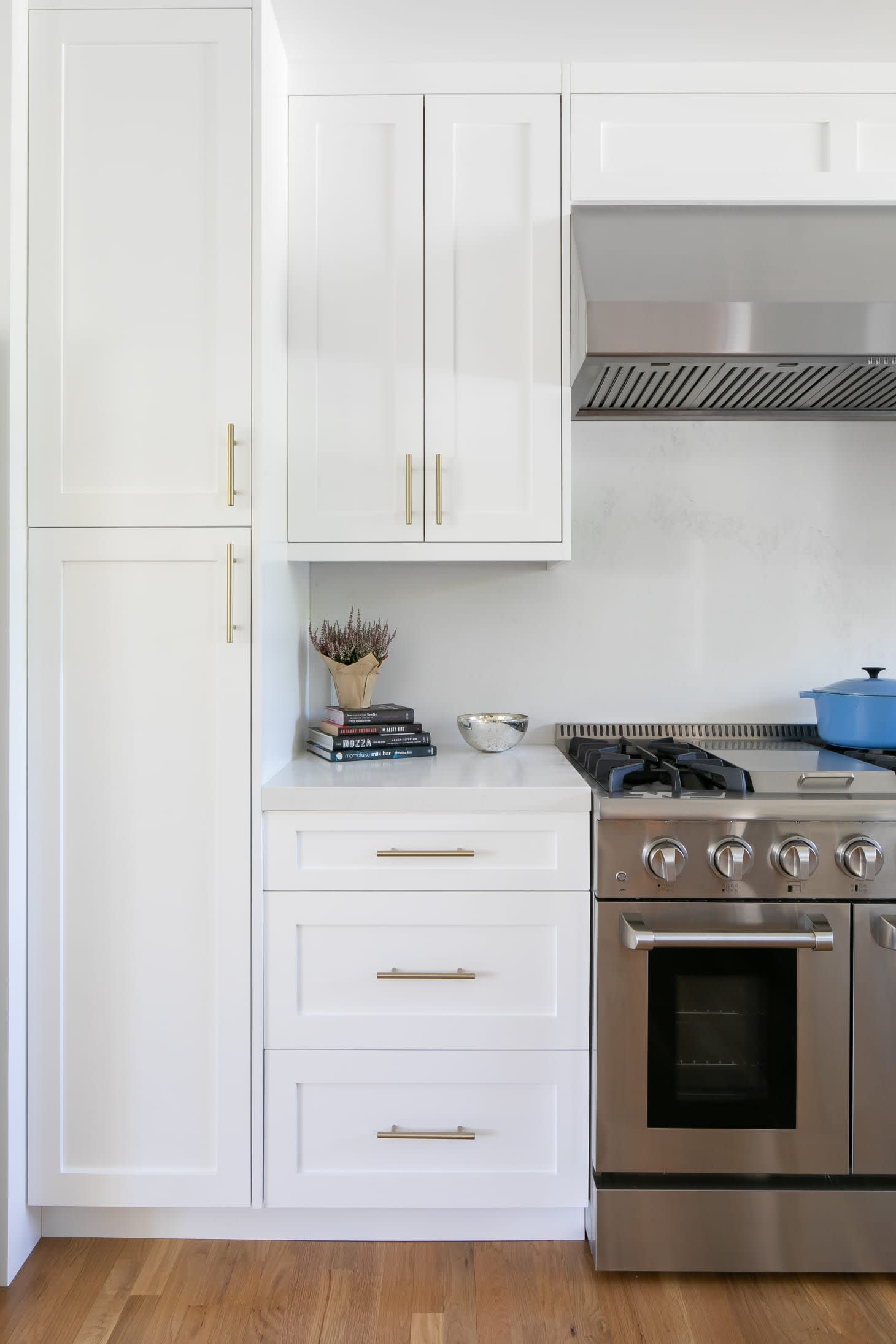 To create a uniform look in your kitchen sans the pricey integrated appliances, try painting all of your cabinets (and your island if you have one) the same color to create visual continuity and the illusion of more space.