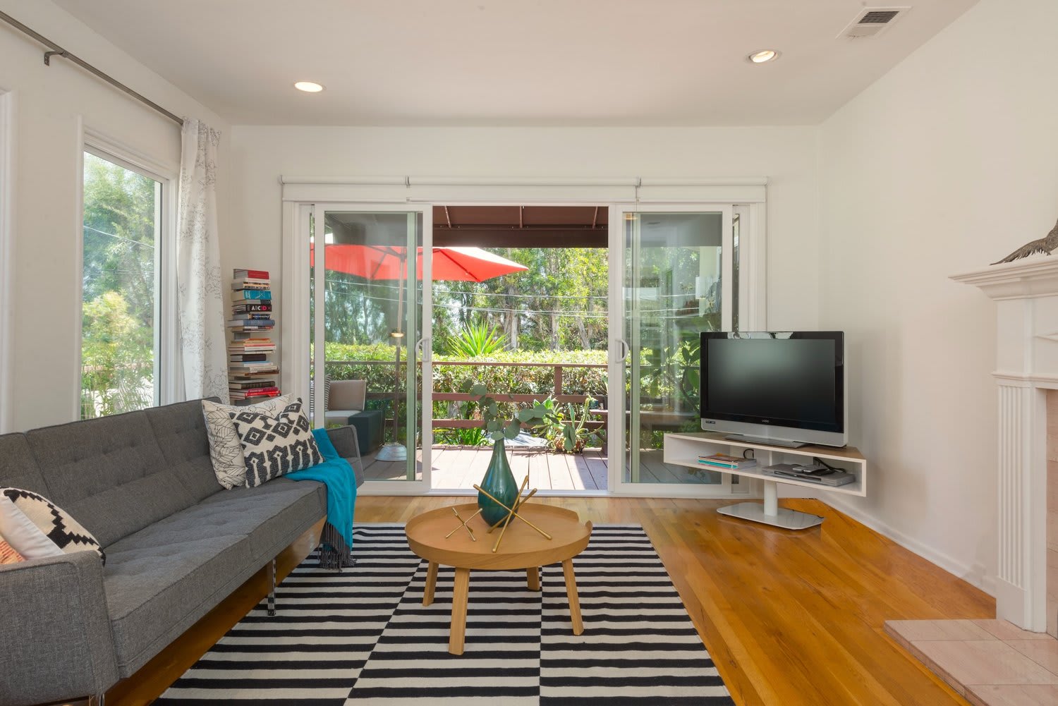 Just off Mulholland Drive, with easy access to all, this 1940's modern is perched high above the street to take in all the good canyon vibes. Gated and walled for privacy, with several intimate outdoor entertaining areas including a front deck with city light and Observatory views. Just a walk to Runyon Canyon and 5 minutes to the Hollywood Bowl overlook.
