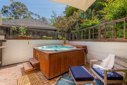 The master suite is a highlight with sliding doors to the front deck, walk-in closet, built-in bookcase, and a radiant master bath featuring a huge frameless glass and marble shower with skylight and vaulted ceilings. The master bath opens to the outdoor spa and private rear entertaining areas. Second bedroom also opens to the outdoors.