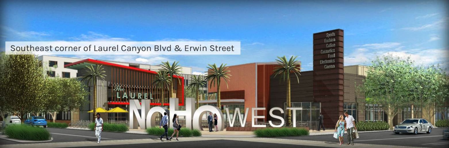 NoHo West is a joint venture between developer Merlone Geier and GPI Companies. The 25-acre site, the former playground to North Hollywood's Laurel Plaza shopping center, will be a mixed-use development that will include apartments, shops, restaurants, 24 Hour Fitness, Trader Joe's, a multiplex cinema and much more.