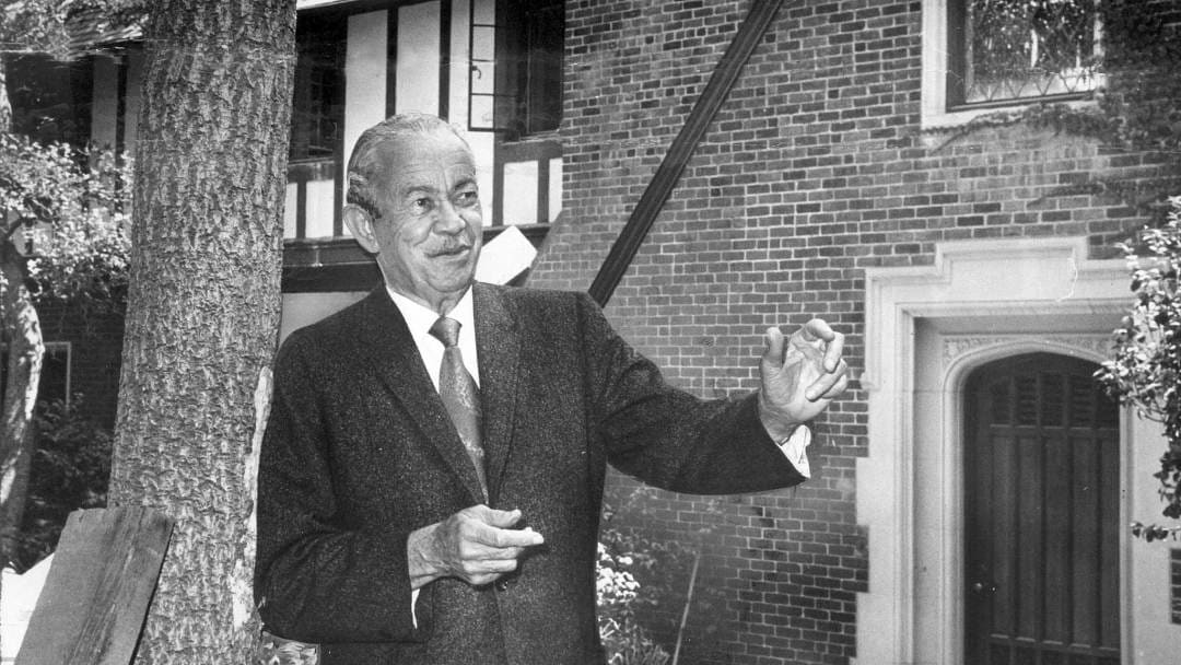 Architect Paul Revere Williams in 1970, standing before a Tudor mansion he designed in 1928. (Los Angeles Times)