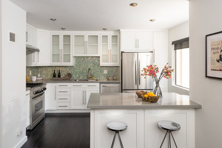 Sleek chef's kitchen with custom cabinetry and breakfast bar with built-in microwave. Quartz counters in light grey, full stainless appliance package with professional series gas range, double door refrigerator, and dishwasher.