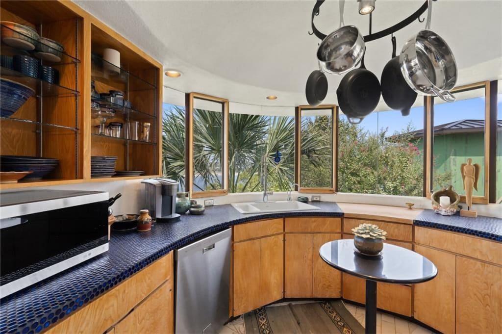 Originally built in 1979 as a second home and studio for Eugenia Hunt, an artist whose name has fallen into obscurity with the sands of time, the eccentric residence boasts three bedrooms, 2.5 baths, plus several decks that provide stunning views of Austin’s surrounding Lakeway neighborhood.